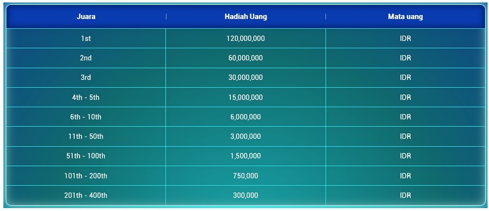 7. Hadiah Turnamen dengan total hadiah senilai IDR 600.000.000 yang akan dibagikan selama periode promosi.