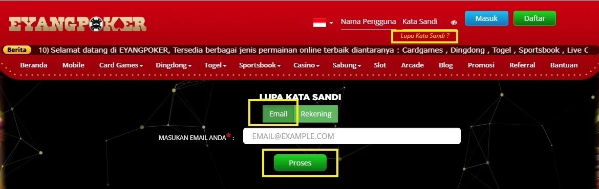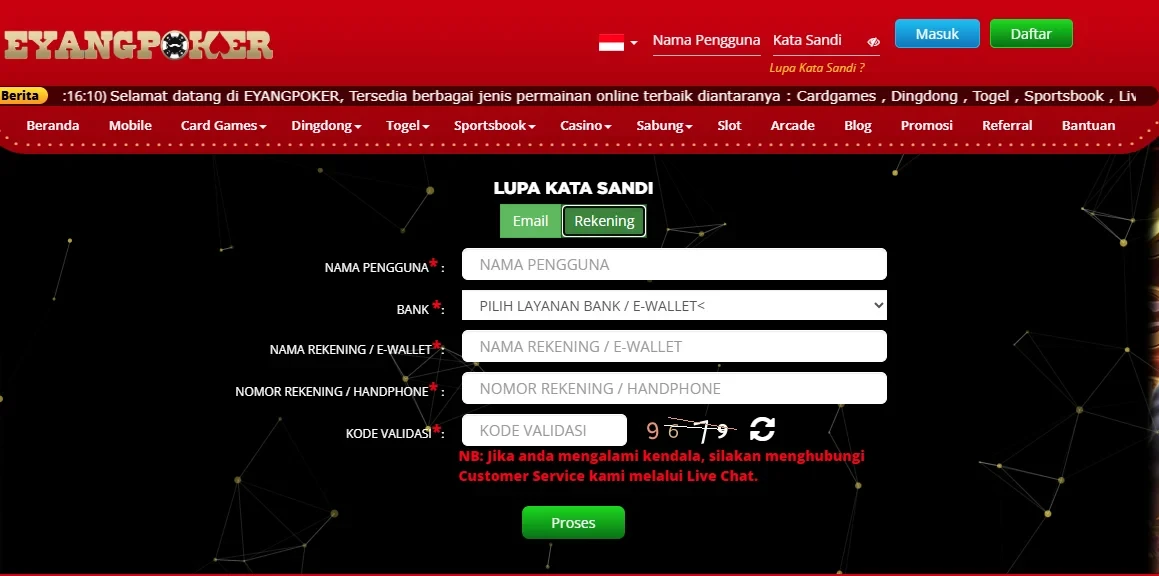 Jika anda hanya lupa password saja silakan klik menu lupa kata sandi pada halaman situs utama kami pada bagian atas, Namun jika anda lupa username dan password silakan hubungi customer service eyangpoker yang siap menyelesaikan kendala anda dengan segera.