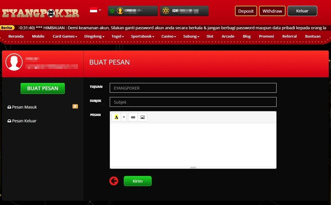 Memo adalah salah satu keunggulan fasilitas di Eyangpoker.com untuk mengirim sebuah berita berisikan informasi, pertanyaan, keluhan atau lainnya kepada operator aktif yang sedang bertugas.